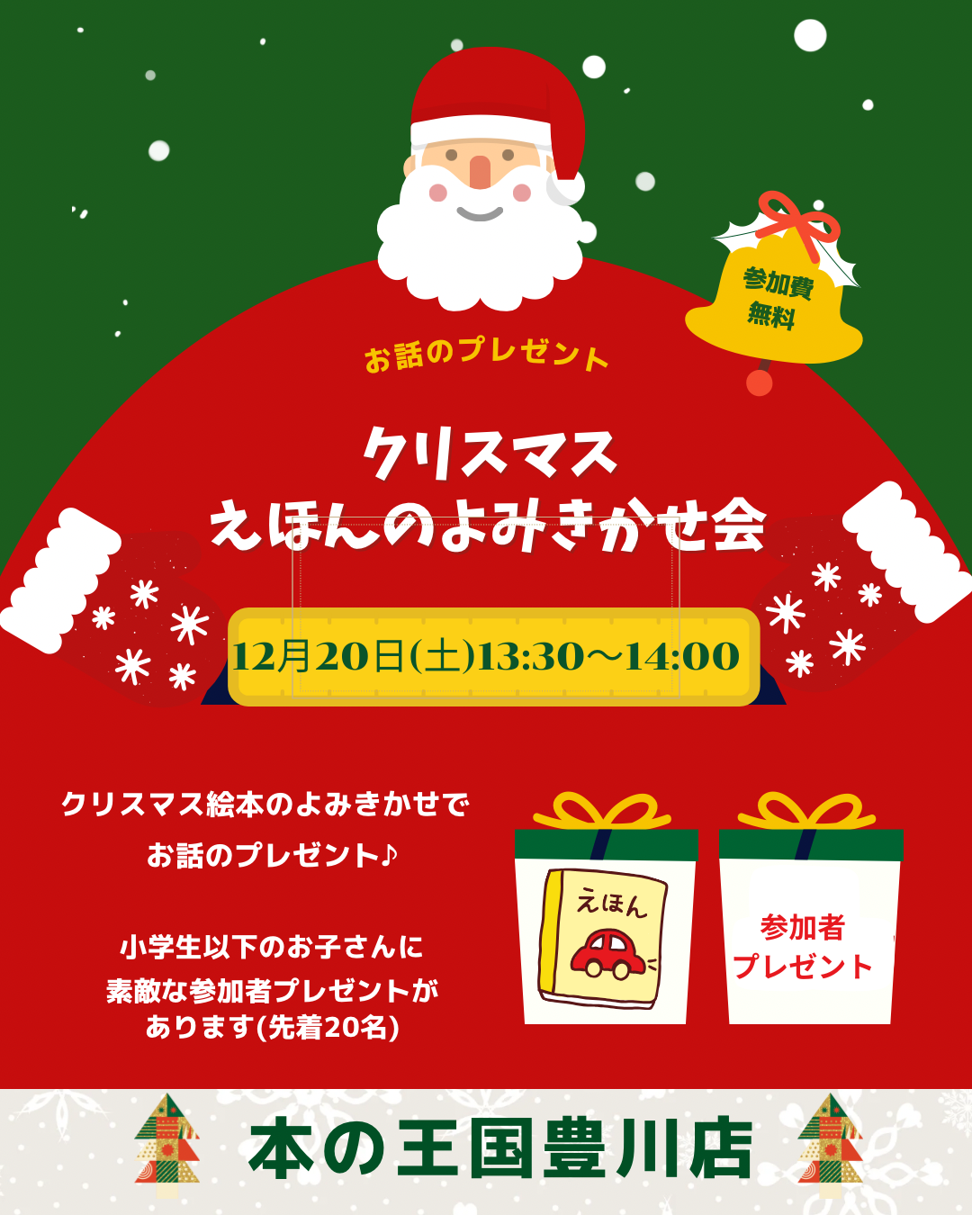 本の王国豊川店様にて「12/20(土)13:30クリスマスのおはなし会」開催します